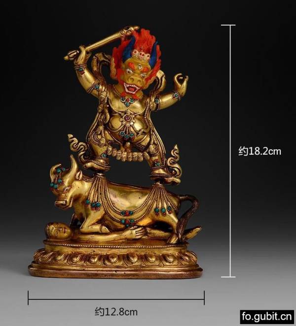 此尊阎魔敌整体体量不小,显现的是极为怖畏的牛头人身形象!头戴骷髅冠,骷髅小巧精致,火焰般卷曲的头发清晰可见;面生三目,圆鼓鼓的三只眼睛炯炯有神,威武霸气!双眉上挑,如刀似勾,鼻梁挺阔,嘴巴大张,露出两排洁白的牙齿,似乎有咆哮般的吼声从其口中发出!嘴角以及两腮的火红的髭须,又将整体威猛的气势表现的更是无以复加!阎摩尊身体健壮,四肢结实浑圆,双臂充分伸展开,右举高举金刚骷髅杖,骷髅杖源自有骷髅饰顶的手杖或湿婆教信徒的天杖,象征着“终止”或者业力的“死亡”及“万象皆空”,作为武器,它能恫吓所有恶魔并降伏“三界”中一切邪恶鬼怪;周身佩戴璎珞、人头长链、臂钏、足环等装饰,而其上镶嵌的各色宝石更是衬托的整体华丽精美,加上两侧绕肩飘逸的缯带,更是活化了整件作品!双足右屈左伸呈弓步站立,下踩水牛,充分表示了降服阎魔的骄傲与残暴,其动作似乎是即将翩翩起舞,又或者即将参加一场战斗,将一切恶魔就地正法!足下所踩水牛身体肥硕,表情凶愤,前肢跪倒,后肢蹬踞,背饰连珠式璎珞,下踏在单层莲座上的作恶者“挪细”的尸体之上,其比例与肌理均十分写实!下承的莲花宝座,莲瓣层次丰富,宽大肥润,而在莲瓣上缘还饰有连珠纹,珠圆玉润,细密精致,在莲座背面还有阴线刻画的纹饰,更显质朴大气,气势十足!其下又为原装藏,并有十字降魔杵加以封固,堪为清代西藏官造中的精彩作品!