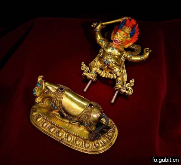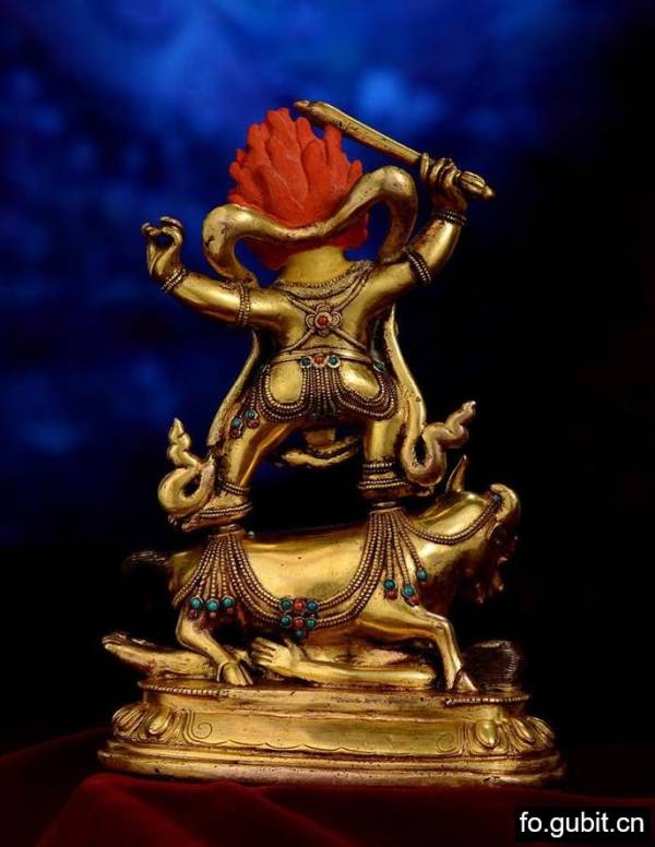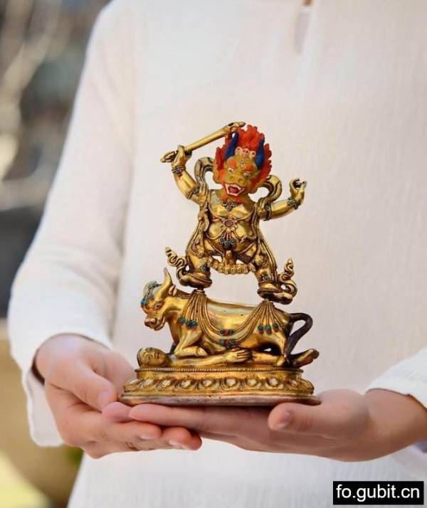 整尊造像共三部分,每一部分都极为精致!主尊形象威猛,比例协调,姿态极为富有张力,细节的刻画也尤为精细!还有水牛背上的连珠璎珞,低矮稳固的莲座,均打磨的亮丽夺目!而造像上的金彩与身上镶嵌的宝石的相称,更为流光溢彩,绚丽夺目!整体表现出极高的艺术造诣,真真够足稳重大气的视觉效果,气韵十足!此题材可参照的精品之作寥寥无几,作品亦难以见到,其珍贵程度自不言而喻!