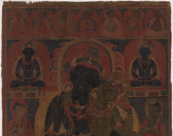 Based on the identity of its Nyingmapa patron, who is pictures in the lower right corner, scholars have dated this painting to the late 11th century. If correct, this is one of the oldest surviving Tibetan thangkas in the world. It shows Vajrasattva, considered by Tibetan Buddhism’s Nyingma Order as the “knowledge bearer” and intermediary through whom all teachings must pass into the human realm. He warmly embraces his consort, presumably Vajradhatvishvari, who wraps her legs around him from behind, and he holds in his hands the thunderbolt and bell, symbols of compassion and wisdom. Although usually described as white, the couple are oddly colored blue and green, but Vajrasattva is identified by an inscription, like all the deities and teachers that surround the central pair. This thangka’s sinuous forms, simple composition, perfunctory shading, and muted coloration reflect the strong influence that Eastern Indian art associated with the Pala Dynasty (ca. 8th-12th centuries) had on early Central Tibetan painting.