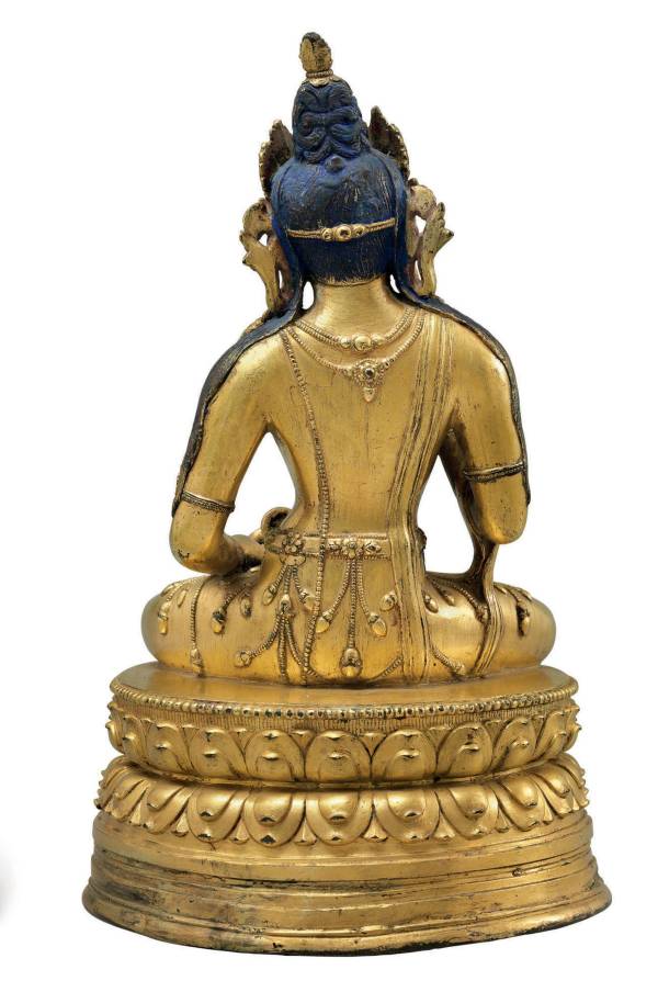 Seated in dhyanasana on a tall double-lotus base with beaded rim, his hands holding a vajra and bell, wearing a dhoti incised with floral pattern at the hem, adorned with beaded festoons and ornate jewelry, the serene face with elongated eyes and raised urna, the hair pulled into a high chignon and topped by a finial, secured with a foliate tiara with locks falling onto the shoulders