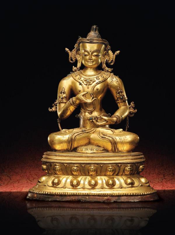 金刚萨埵是藏传佛教密宗极为推崇的圣尊,是消业灭罪的唯一主尊。常持本尊真言,能破除烦恼,止诸恶念,生诸功德。此尊造像面相宽阔,神态慈悲祥和。耳戴镶绿松石稻穗状坠饰,具有尼泊尔造像艺术特征。在十三至十四世纪迦舍末罗王朝时期造像中较为常见,并对明代西藏地区造像有很深影响。耳际两旁缯带扬起,颇具帕拉造像遗风,在元代藏西拉达克风格造像较为流行。身躯宽肩细腰,胸膛挺起,肌肉饱满,肢体刻划厚实,展现出雍容大度的气势,具有元代西藏造像时代特征。项挂嵌绿松石花苞坠,腕戴镶嵌绿松石双圈手环,项坠和臂钏的卷叶纹装饰,细部刻画粗犷。束腰仰覆式莲花座,莲瓣饱满圆鼓,背面光素,为十三至十四世纪西藏常见莲座形式。台座背面涂红漆,此法见于尼泊尔西北部造像,并影响藏南地区。此像面容特征和装饰手法,颇近似尼泊尔北部山区的木斯塘洛日佛塔壁画纽瓦尔工匠的艺术风格。不丹博物馆收藏一件十五至十六世纪铜鎏金金刚萨埵,与此件作品于风格特征上,极为相似。