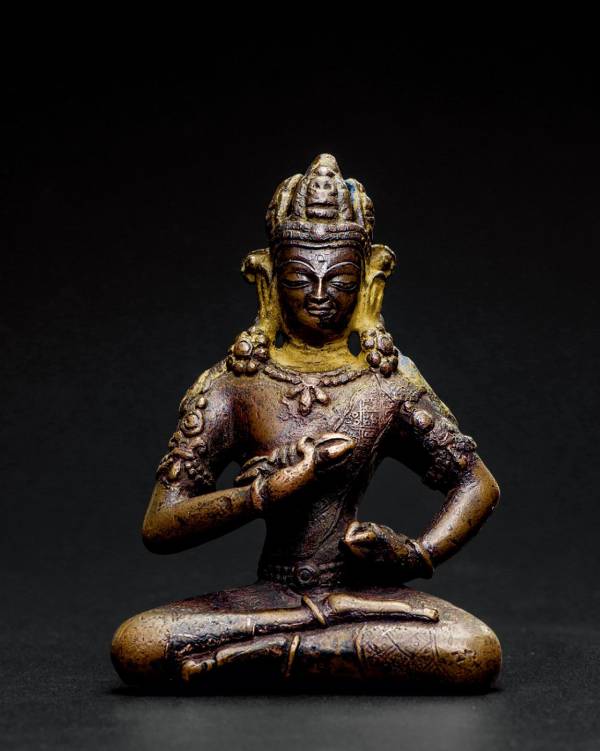 本件金刚萨埵通体由红铜铸造,头戴三叶冠,冠叶内收,于顶部聚拢。为尼泊尔里查维王朝时期的经典样式,五官紧凑,面容慈祥,双耳佩戴花型耳铛,面部有泥金痕迹,可见本像曾在寺庙供奉。本像铜质纯净,包浆厚重,且手持法器保存完好无缺损,殊为难得。