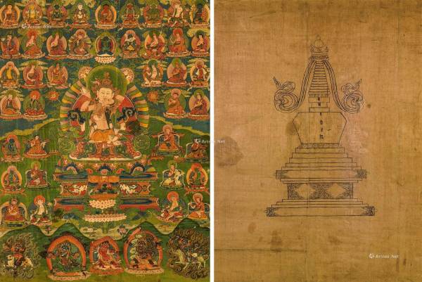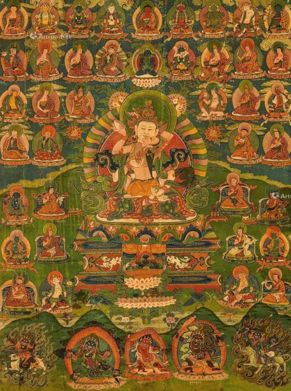 此幅唐卡表现的是白色双身金刚萨埵。主尊身白色,右手当胸持金刚杵,左手腰间持金刚铃,并拥抱明妃,结跏趺端坐于莲花狮子宝座上。头戴五叶冠,发髻高束,眼睑微垂,庄严肃穆。身着蓝色披肩,下身着红色长裙,并嵌金色团花,极其奢华。明妃右手执钺刀,左手托嘎巴拉碗,双腿盘于主尊腰间。主尊上方是宁玛派尊崇的法身普贤双身佛,法身普贤左边是双身金刚持,右边是莲花生,再外侧是宁玛派历代祖师,每尊像下方均有金书藏文尊名。最上方一排正中是无量光佛,两侧有五方佛等;最下方一排是宁玛派护法神。画面以红绿两色为主,点缀花草树木,构图严谨,布局规范,造型庄严,色彩和谐宁静,具有鲜明的宁玛派宗教特色,体现了藏东地区勉萨画派风格特点。