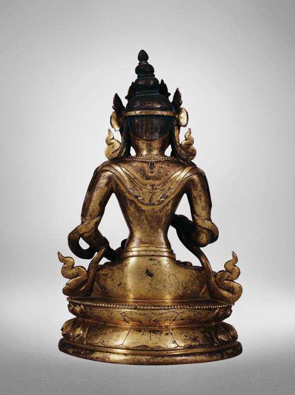 此尊造像面庞圆润,眉目修长,鼻准挺俏,双唇微抿,嘴角上挑,且头部向左微侧,仪容温和。梳葫芦形发髻,高高束起,头戴五叶宝冠,宝缯于耳后卷曲,呈“U”字,双垂耳饰大耳圆铛。左手持金刚铃,右手于胸前结印,似托一物已失。丰肩细腰,上身袒露,胸前饰璎珞,连珠方圆,颗颗分明,并饰臂钏、腕钏,下身着僧裙,叠落于双腿之上。披帛绕肩穿臂自然垂落。结全跏趺端坐于仰覆莲台座上,莲瓣整齐,上下缘分饰连珠纹一周。整尊金刚萨埵形象典雅优美,雕工细腻。