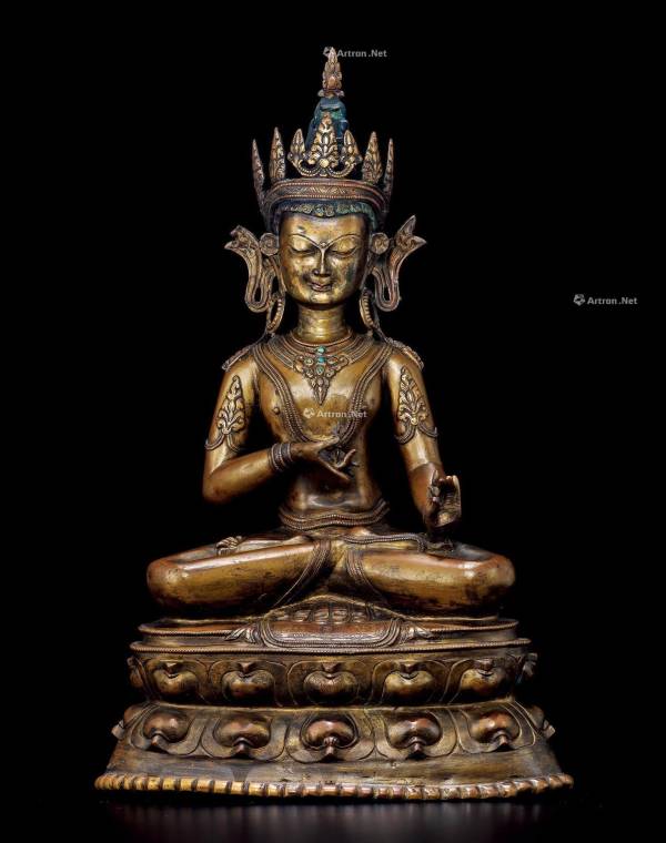本尊金刚萨埵体态优雅,尊像全跏跌坐,头戴五叶宝冠,其冠侧宝缯于耳后起伏,仿佛随风摆动,自然飘逸,长耳垂挂耳饰,穗尾垂落双肩摇晃。其眼帘微垂,目光柔和而坚定,双眉细长直入高鼻,嘴角微微扬起,面容安详慈睦。其右手持金刚杵于胸前,左手结说法印,比例协调,典雅高贵。主尊衣饰繁复华丽,颈佩项圈,璎珞,嵌绿松石,腕、臂等均饰宝钏。造像整体比例精准,面貌俊美,纹饰绚丽,乃不可多得的佛教造像精品。
