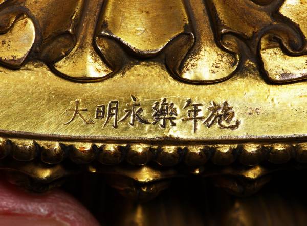 尺寸:底径11×15厘米,高21.4厘米 年代:明代永乐 质地:铜鎏金 风格:永乐宫廷 来源:北京故宫博物院 参阅:外部链接 鉴赏:
