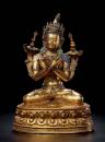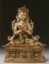 其次,索南坚赞善于使用独特而精细的方式对造像身上的镶嵌物和璎珞进行处理。镶嵌位置十分多样,时常出现在头冠、耳铛、臂钏、璎珞等部位,每块镶嵌石均被精准的切割成圆形或水滴形,装饰效果华丽。网状的璎珞多在菩萨围裙处自然垂下三缕连珠,两腿之间及双腿各一条,璎珞末端做成花苞的样式并进行镶嵌。索南坚参以独特和精致的方式处理珠宝。每一粒嵌入的宝石都将细致地切割成微小的圆形或泪珠状。这些镶嵌的宝石,在整片金光中对比更加强烈,显得熠熠生辉。