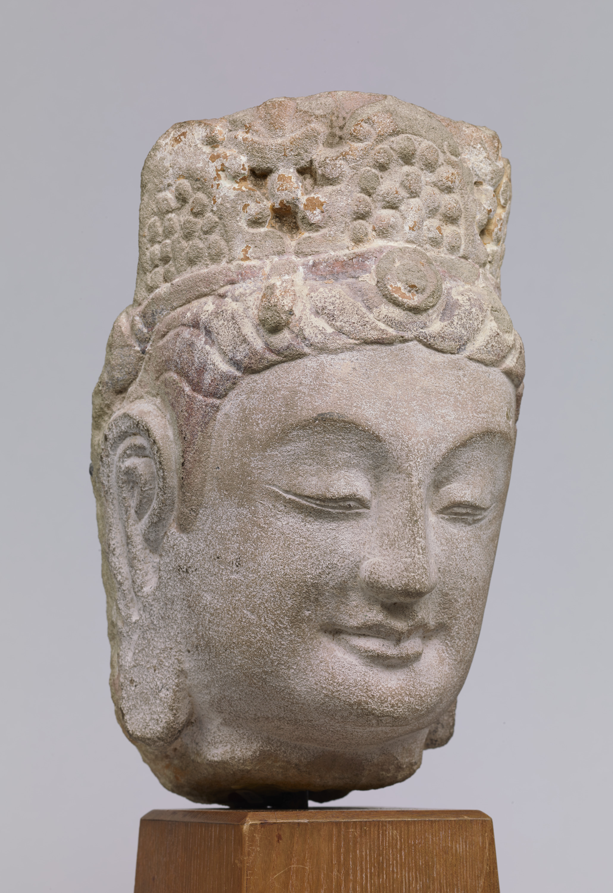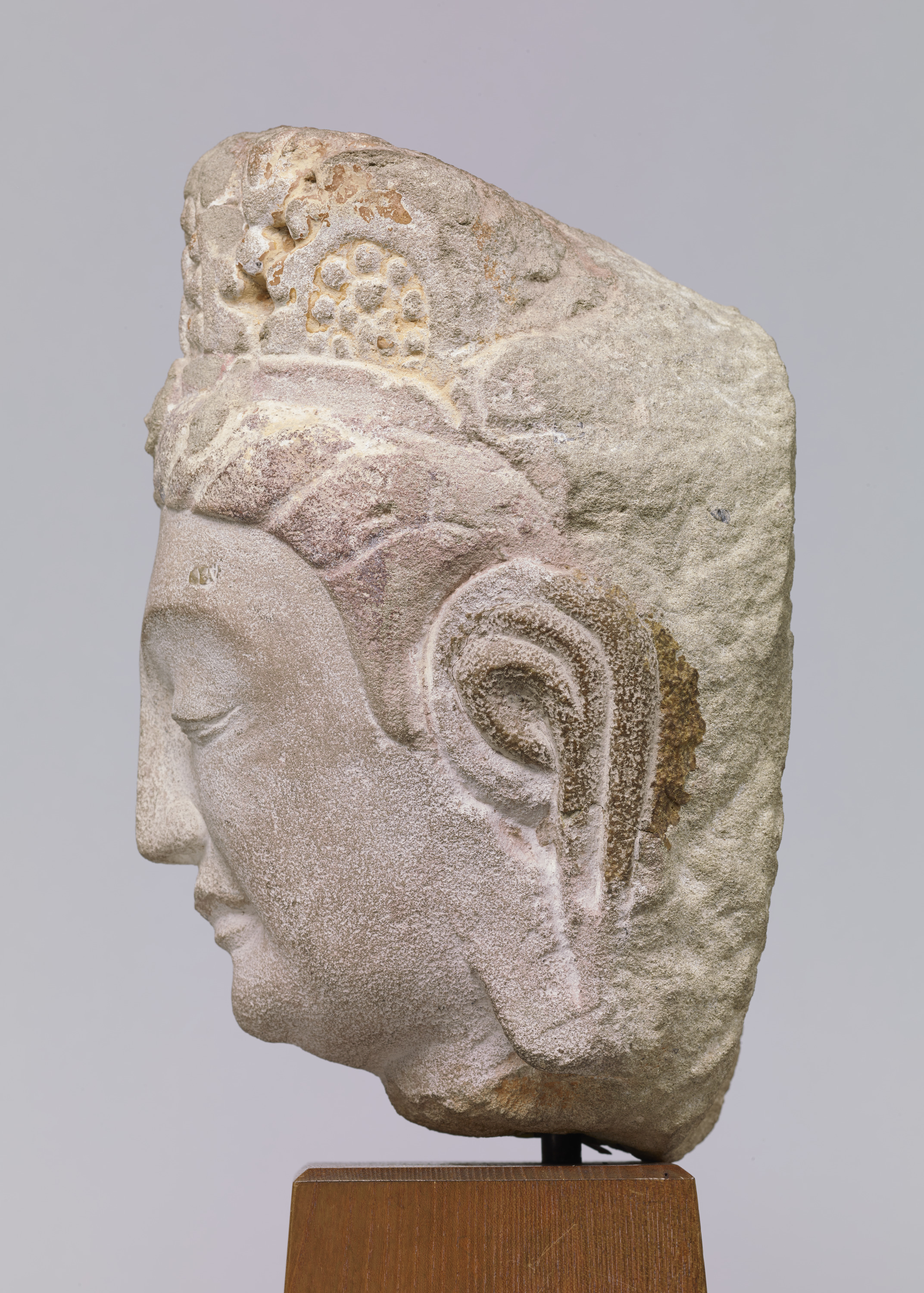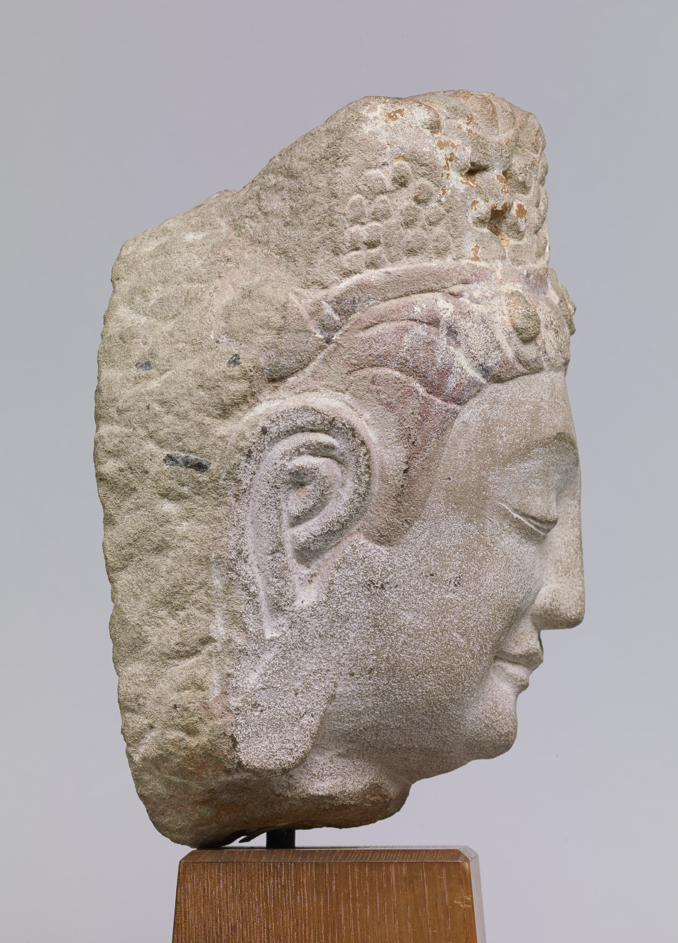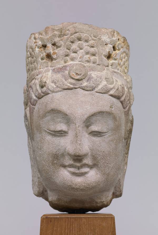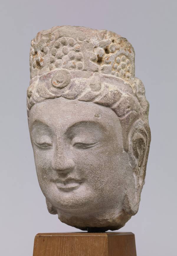 This is the head of a bodhisattva statue that once adorned the east wall of Cave No. 8 at the Tianlongshan Grottoes (来自天龙山石窟第8窟). Its style is reminiscent of that of the preceding Northern Qi dynasty.