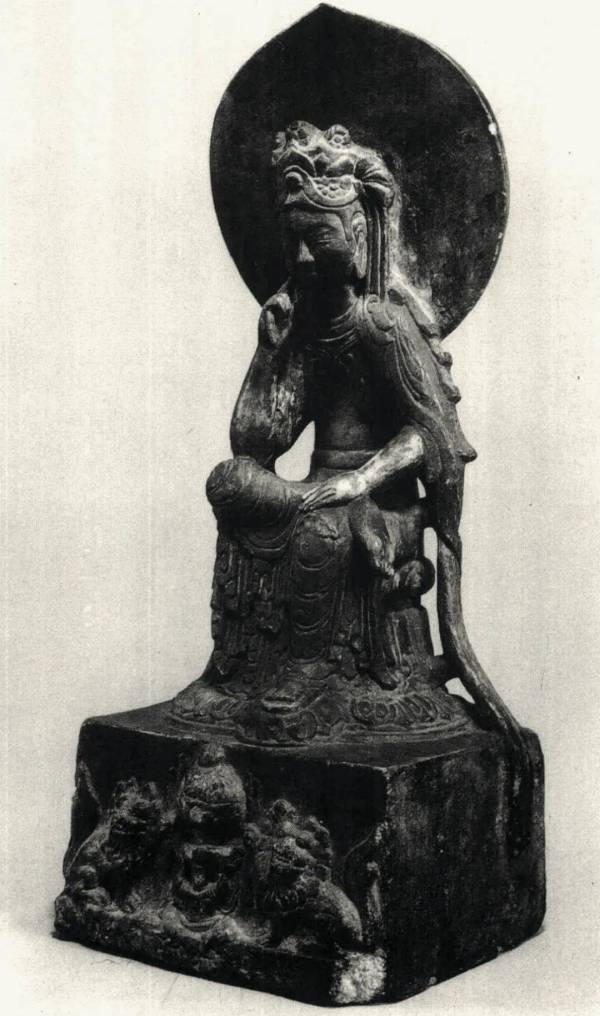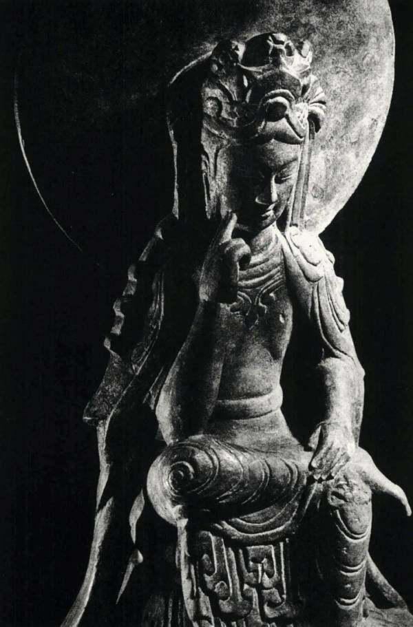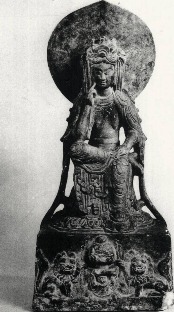 尺寸:高54厘米 年代:东魏武定二年(544年) 质地:铜鎏金 风格:石雕 来源:东京书道博物馆 参阅: 鉴赏: 桃形相光衬托华美宝冠,菩萨右腿盘曲于左腿之上,高坐于莲台,右手上举,肘撑右膝,食指支颐作思维状。上身袒露,佩项圈,双肩披帛,帛巾绕臂垂拂于体侧,延伸至座下。束腰长裙,衣纹双线阴刻,随体转折,裙缘下垂至莲台。莲台下为方形基座,立面正中浮雕博山炉,下有力士相托,左右为侧身正面相蹲狮。造像比例适中,动态和谐,刻工细腻工整,刀法流畅。后有发愿文:“武定二年太岁在甲子十月甘日清信士佛弟子戎爱洛、妻赵阿睹、女慈仁、敬造白玉像一躯。上为皇帝陛下、下为亡父母、亡息善□、普及法界众生,一时成道。”