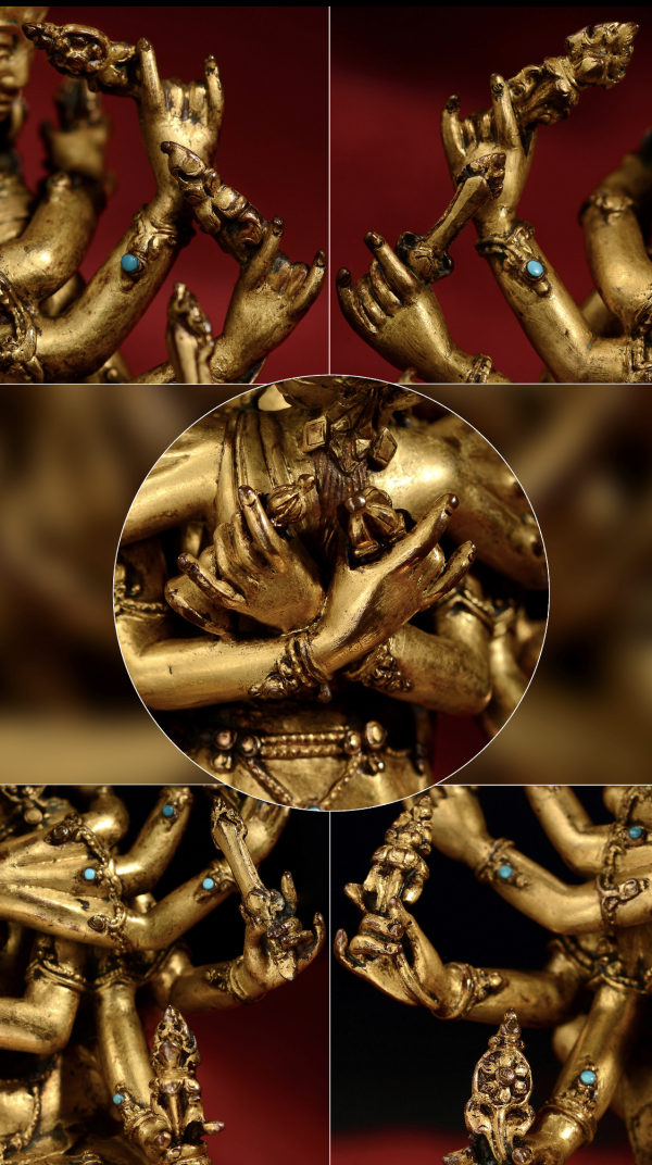 品相十分完美,工艺极为精美。手里的法器一个不缺,更没有伤残,周身镶嵌老松石,这在同类造像中是十分罕见的。