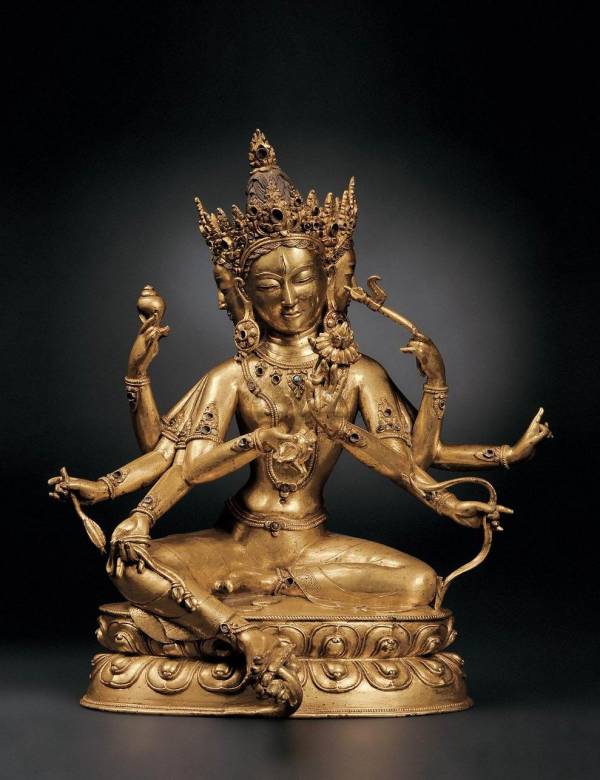 尊胜佛母,藏语称为“措道那木玛雅”,又称为顶髻尊胜佛母。与无量寿佛、白度母合称长寿三尊。修持其法门,能增长寿命及福慧,消除罪业和凶灾。结游戏坐于莲花宝座之上。三面八臂,三面皆戴花冠,头顶共结一发髻,髻顶饰摩尼宝。面具三目,呈寂静相。八臂各手皆法器,主臂右手持金刚杵,左手持一朵莲花。右侧第一只手持海螺,第二只手持箭,第三只手持绳索。左侧第一只手施金刚戟,第二只手结期克印,第三只手执弓。上身袒露,胸前配饰项圈璎珞,腰系连珠腰带,下身着长裙,轻薄贴身。束腰仰覆莲座,莲瓣饱满圆润,制作规整,具有明显的时代特征。