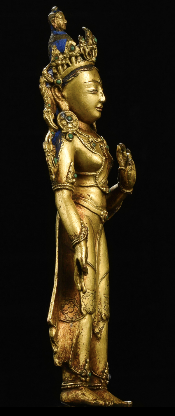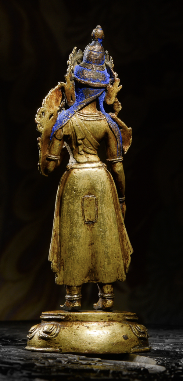 我们看到的这件雕塑作品是非常典型的16世纪作品,这是一个在吸收印度、尼泊尔艺术风格,不断融合发展后西藏本土造像艺术最终定型的时期,也是一个技艺精益求精、臻于巅峰的时代。抬眼望去,度母以优雅姿态立于世间,左手轻捻盛放莲花,如觉悟的智慧香飘人间;慈悲救济的右手下探结予愿印,将佛法甘露撒向苦楚众生。传递出度母由观音的眼泪幻化而来以莲花开示和教化众生的深刻用意。度母头戴宝冠,正中叶片突出,两侧叶片次之。发髻高束,上有化佛,余发披于后肩,额前可见清晰髻缕走势。脸型呈卵圆形,貌如年轻女子,双眉与鼻梁相连,眉梢上翘,目光下敛,嘴角略露微笑,形像生动,面容极为清秀俊美。上身袒露,宽肩束腰,体态优雅,身躯呈微微三折枝站立。耳挂圆形大耳珰,颈前饰璎珞,微微隆起的胸部,加强了身体曲线的视觉效果,愈显婀娜。右手弯曲结予愿印,掌纹刻画明晰;左手拈一枝蜿蜒上升开敷于左肩的莲花,代表清净与智慧。臂弯戴与项圈呼应的花形钏环,华丽无比。腰间系带,余下两端垂于两腿间,层层叠叠,极富层次感,尽显灵动,犹如水出山涧,一泻天然。单层莲台上整齐排列着大气舒展的莲瓣,稍稍上翘的双层瓣尖极为有张力. 这尊绿度母体态优美、造型典雅,完美保存鎏金和多处镶嵌绿松石也让造像尽显华丽,充分展现西藏本土造像艺术的特点和魅力,值得收藏。