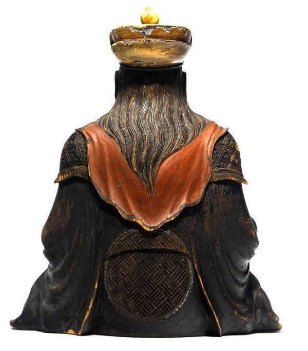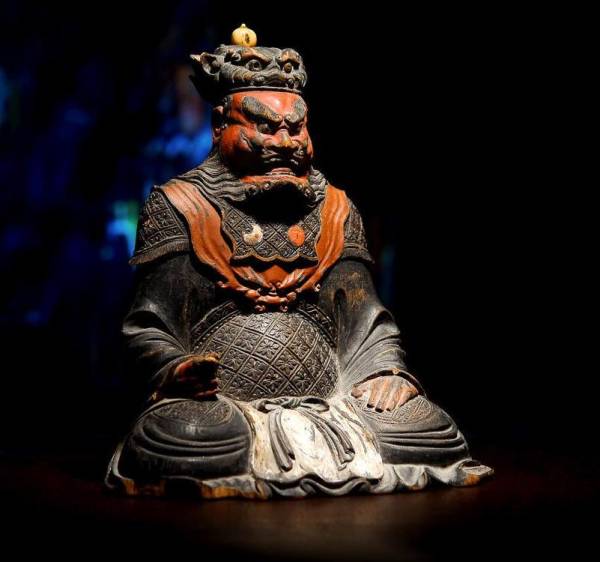 此尊增长天王像为典型的汉传佛教东密所奉增长天王形象,头戴魔羯帽;面部肌肉鼓胀,双目圆鼓,鼻梁扁平,下颌及两腮蓄有浓密须胡;身着甲胄,形象威武彪悍。甲胄的形制完全模仿古代武士装束,其胸、背有两块大铜板保护,腹、腿及臂部用鳞甲覆盖,两肩、手腕及足腕上配有兽头护套。形式虽然十分繁复,但刻画精细,层次分明,而且具有极强的立体感。身后披有倒U字形大帔帛,突出了天王不同于一般武士的宗教神性。整体造型大方,形象生动,做工精细,品相完美,体现了东密造像鲜明特点。从其完好的保存状态和精致的工艺来看,此像显然不是一般民间作坊所为。