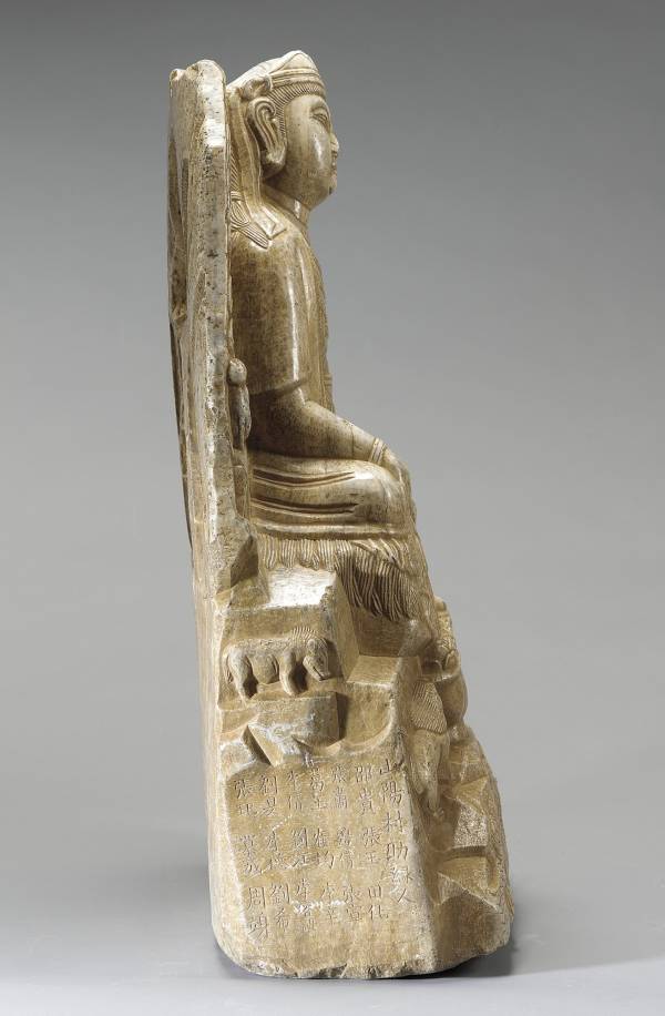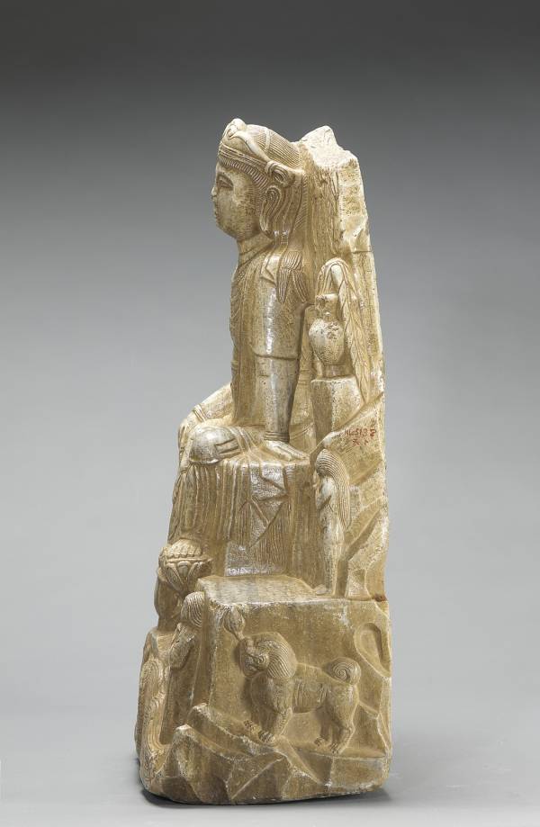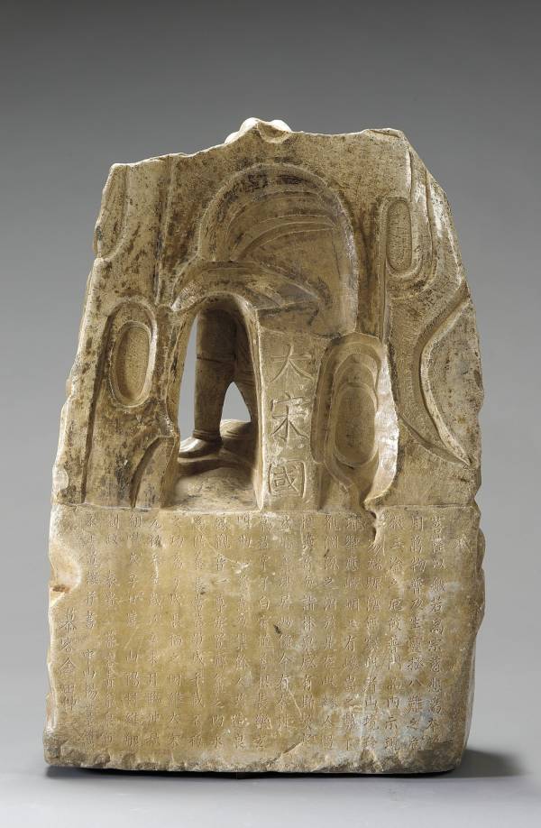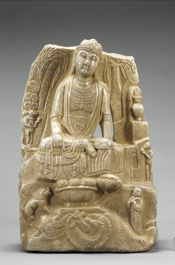观音坐像在岩石壁架上,一条龙从水里出来,动物和人物充斥着观音周围的岩石壁里。在神的左边,一个像人一样的人物,尾巴上有一个孩子,为观音提供了一个碗。背面刻有铭文,日期为1091。