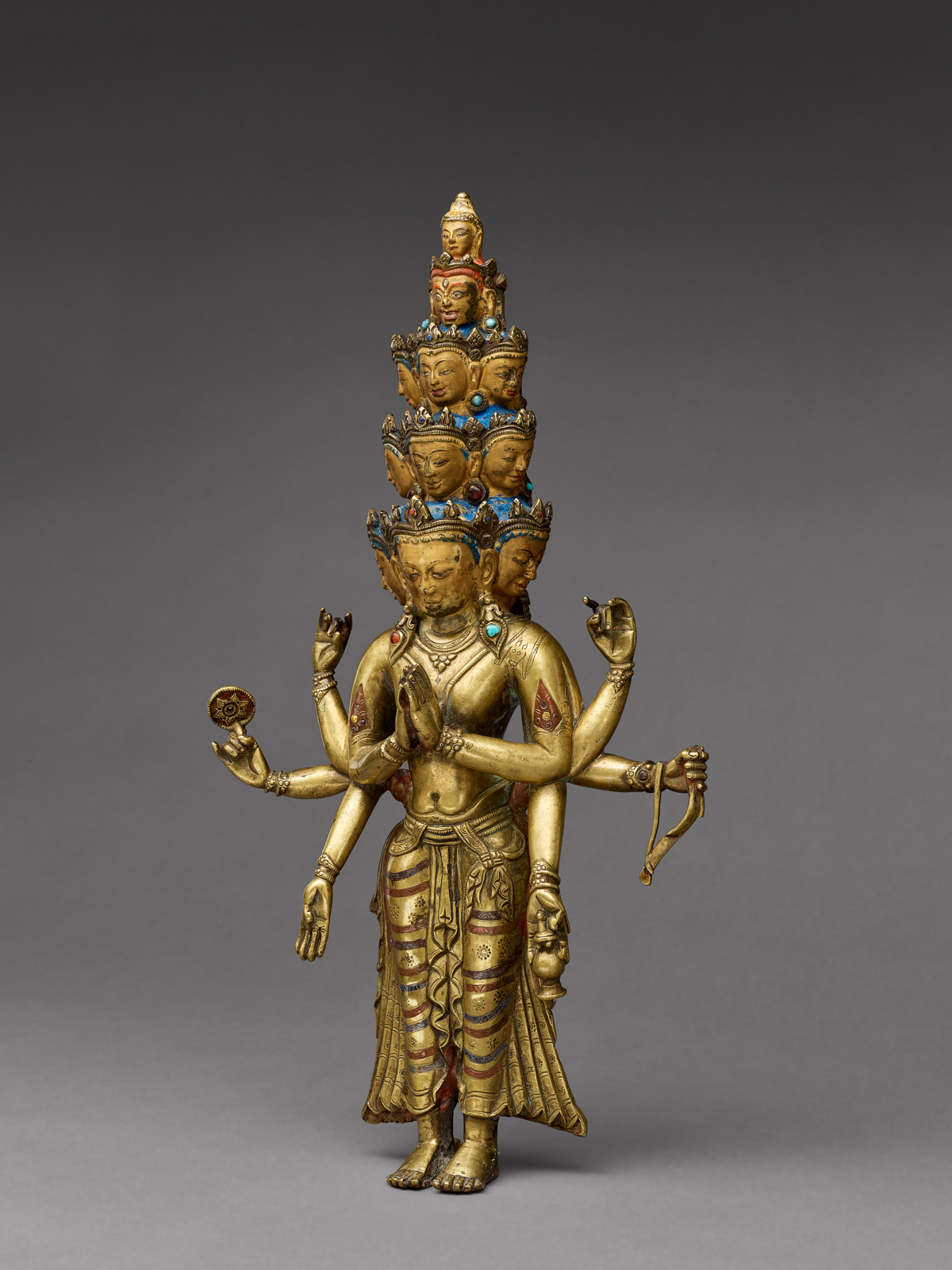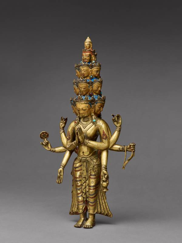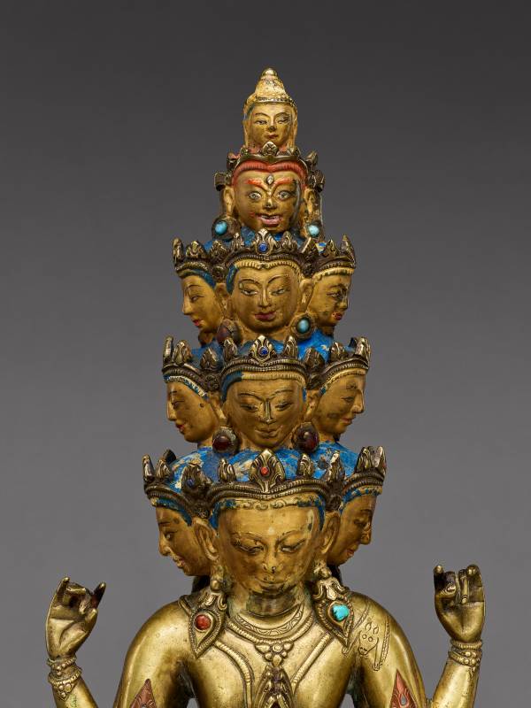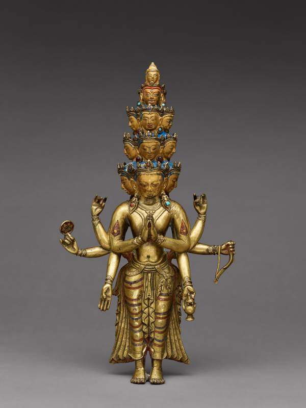 Eleven-Headed Avalokiteshvara is an important form of the bodhisattva of universal compassion. In this rare and early sculpture from western Tibet, inlaid with copper and silver and embellished with turquoise, Avalokiteshvara has eight arms, the central ones clasping a hidden gem that fulfills all wishes.