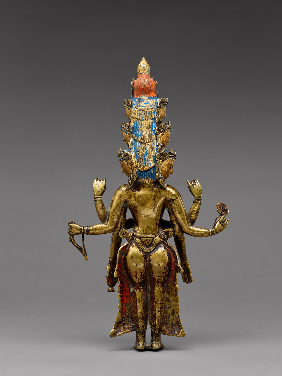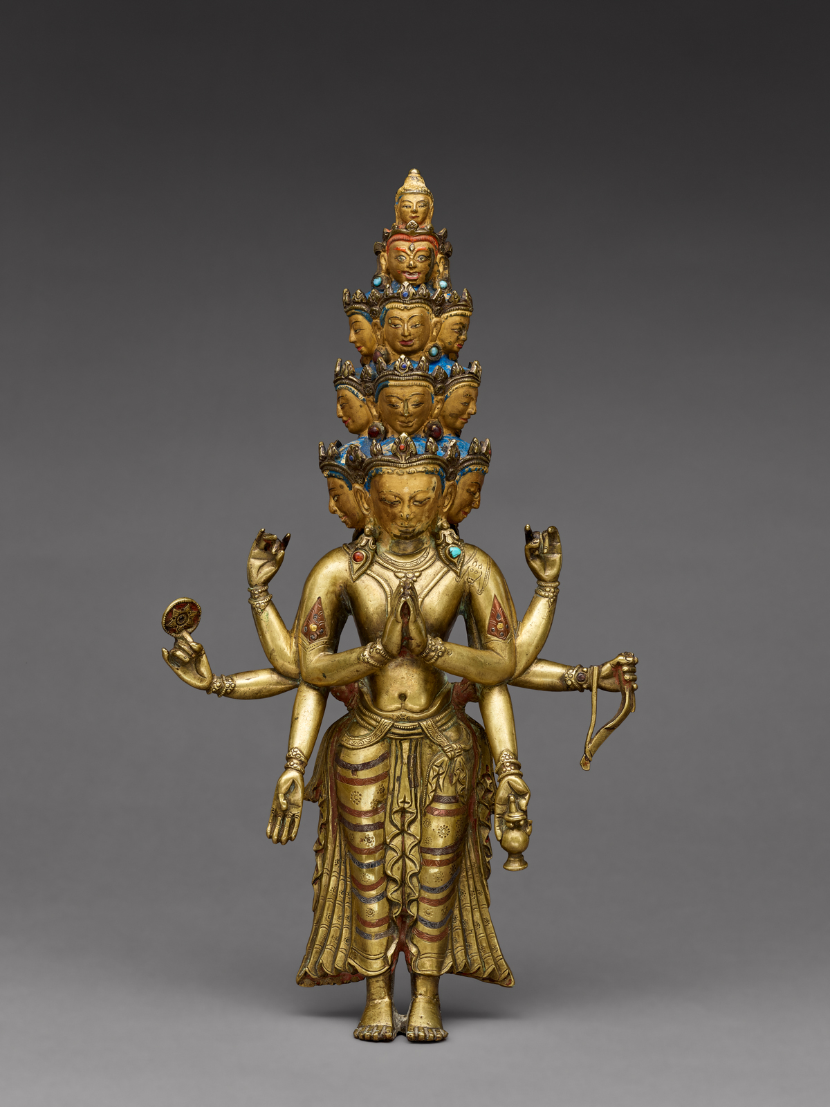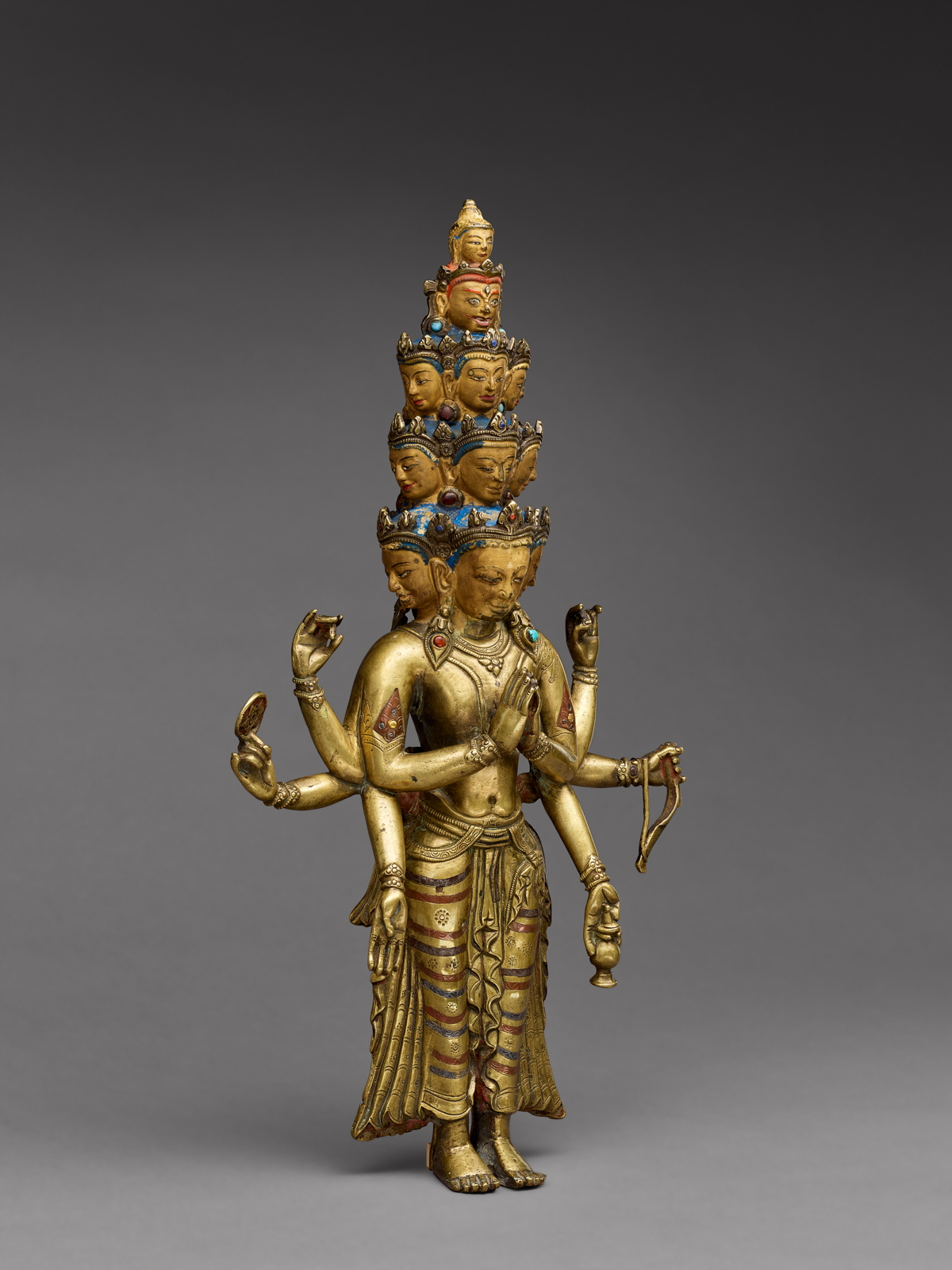 Eleven-Headed Avalokiteshvara is an important form of the bodhisattva of universal compassion. In this rare and early sculpture from western Tibet, inlaid with copper and silver and embellished with turquoise, Avalokiteshvara has eight arms, the central ones clasping a hidden gem that fulfills all wishes.