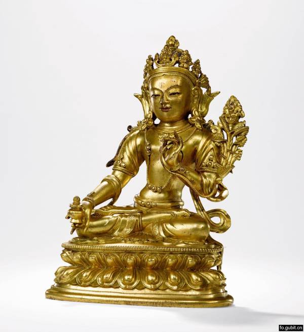 财续佛母是瑜伽密续佛部尊,五路财神之佛母。此造像为一面二臂,面庞圆润,五官清秀,头戴五叶花冠,发髻高盘,长发搭于两肩,发丝刻画清晰,双耳圆珰垂肩。肢体造型丰腴,上身披帔帛,下身着裙,柔美飘逸。右手搭于右膝托如意果,左手于胸前持一茎谷穗延伸至左肩,谷穗象征大地丰收,谷物富足。身姿略呈扭状,幅度并不大,佛母胸部刻画也极为储蓄,几乎难以确定女性神祗身份,这些都更符合汉地造像普遍审美。此尊财续母造像的莲座值得关注,双层束腰莲座,瓣叶修长,且饱满精致,典型的乾隆宫廷造像风格。