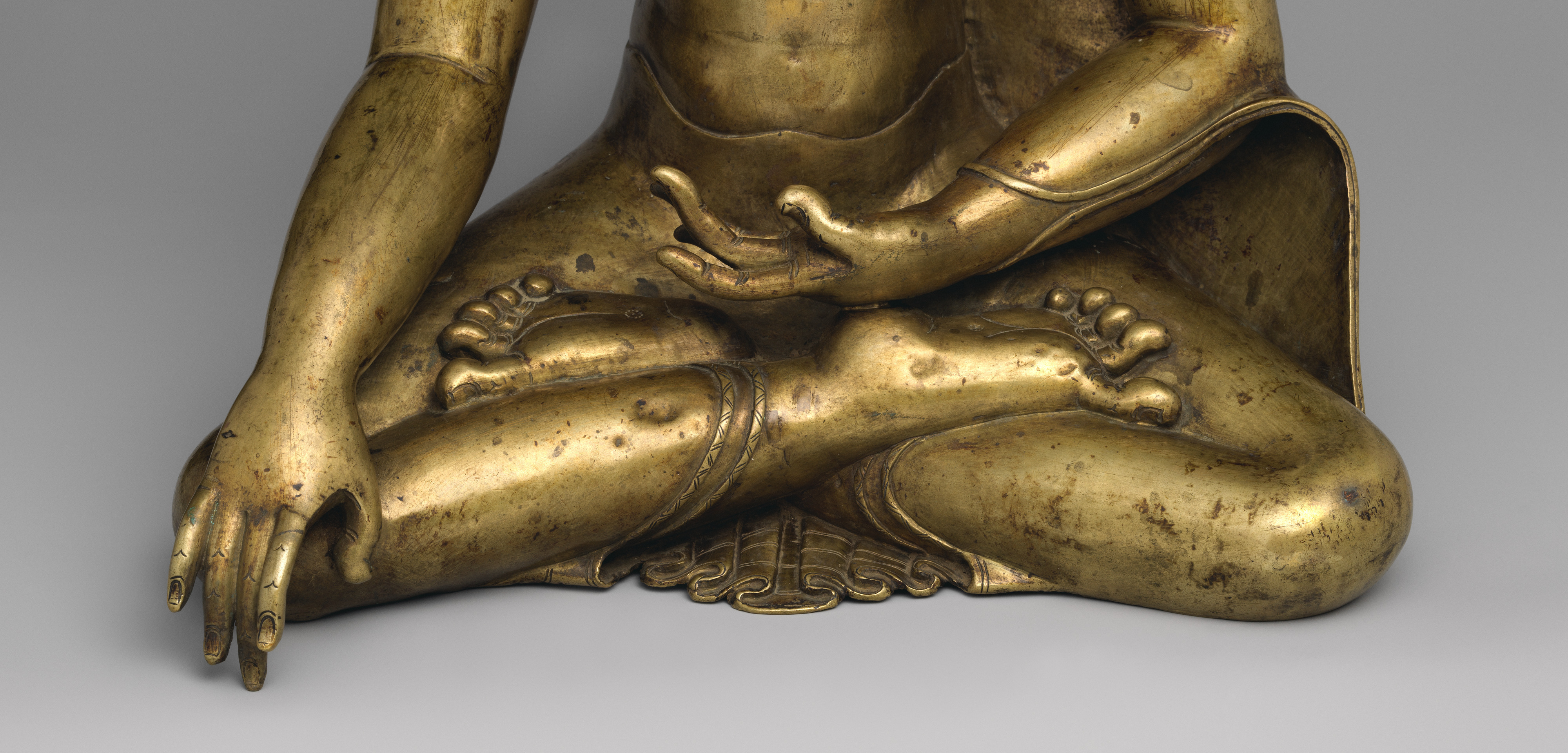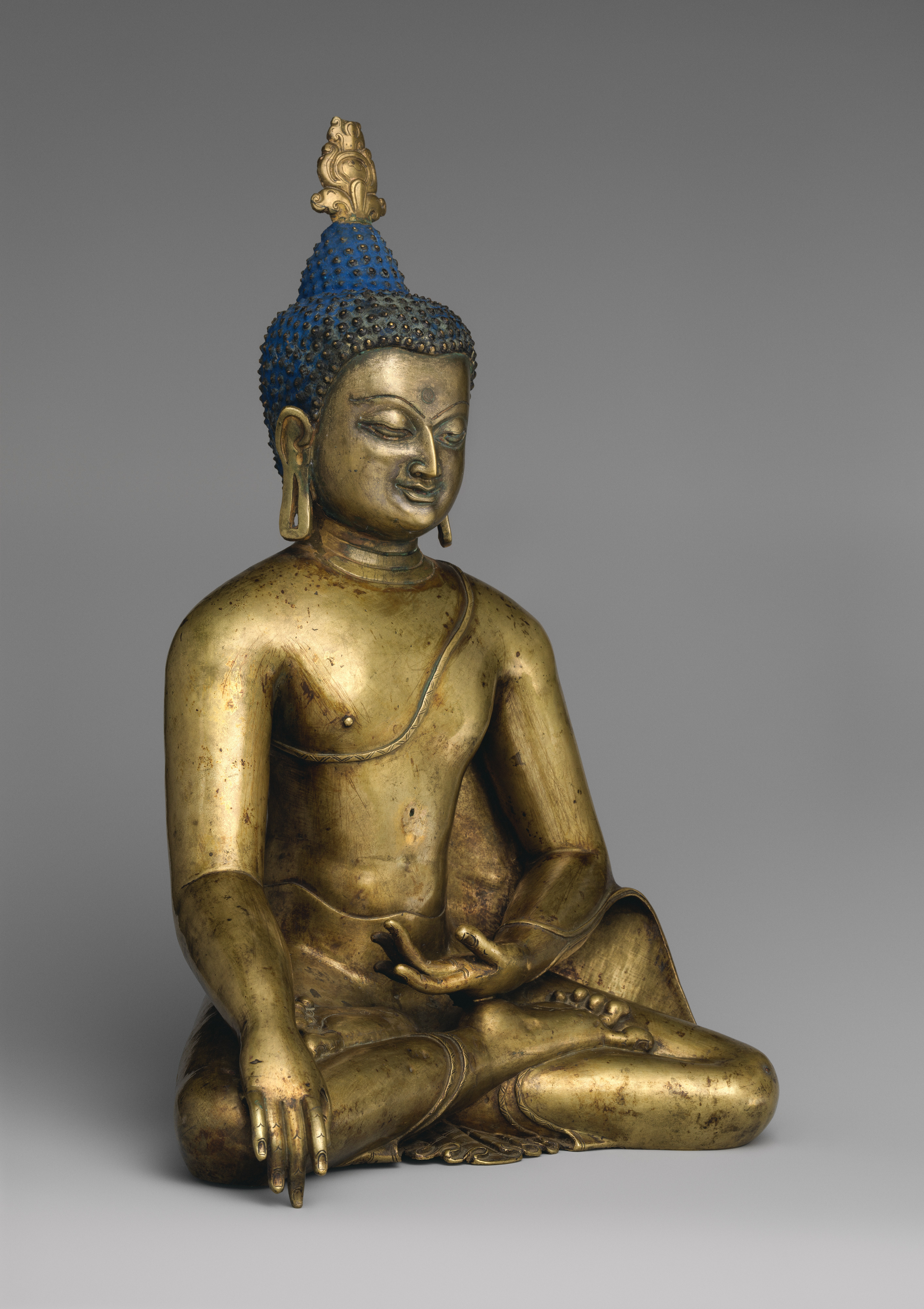 In this sublime and exceedingly rare early medieval depiction of the historical Buddha he is seen seated in a yogic meditation posture, with his right hand lowered and gesturing to the Earth Goddess at the moment prior to his enlightenment, when he steadfastly resistance all the temptations of desire. He displays a number of the auspicious marks of Buddhahood (lakshanas): the extended earlobes, which serve to remind the viewer of the Buddha’s former princely status; the three rings on the neck; the forehead mark (urna, a curl of hair according to texts); and the highly pronounced skull protuberance (ushnisha,肉髻或顶髻). The presence of a flame-like projection surmounting the ushnisha is a rare and significant feature, for although it has a textual foundation, it is rarely represented in Tibetan or indeed Indian Buddhist art. The figure has a refined and smooth surface, with traces of gilding on the face and neck. Skillfully articulated fingers and toes add a poignantly human dimension to this otherwise rather abstracted and ethereal Buddha image. The subtle hint of a smile and the downcast expression masterfully capture the inner calm of Buddhahood and awakened bliss.