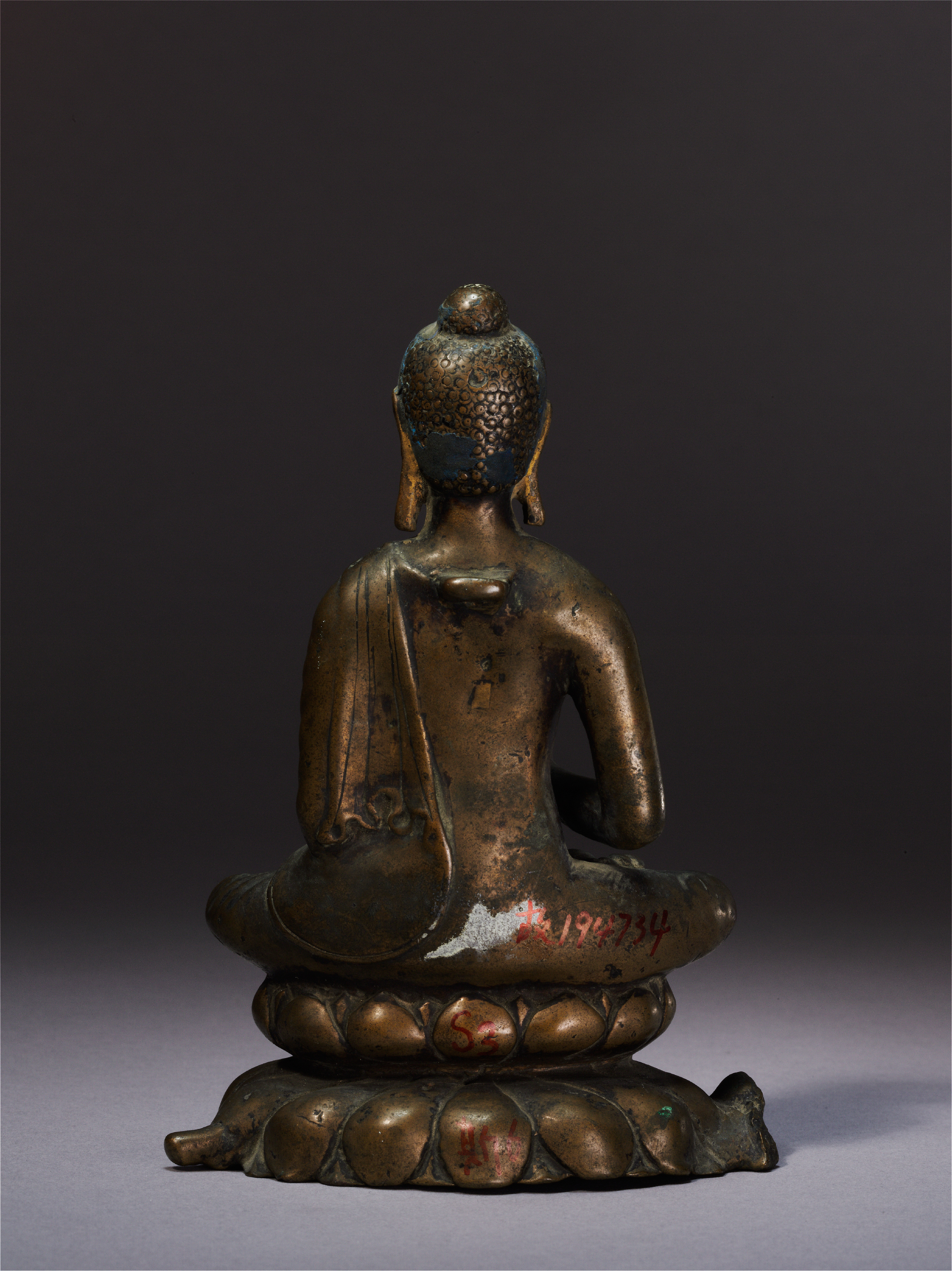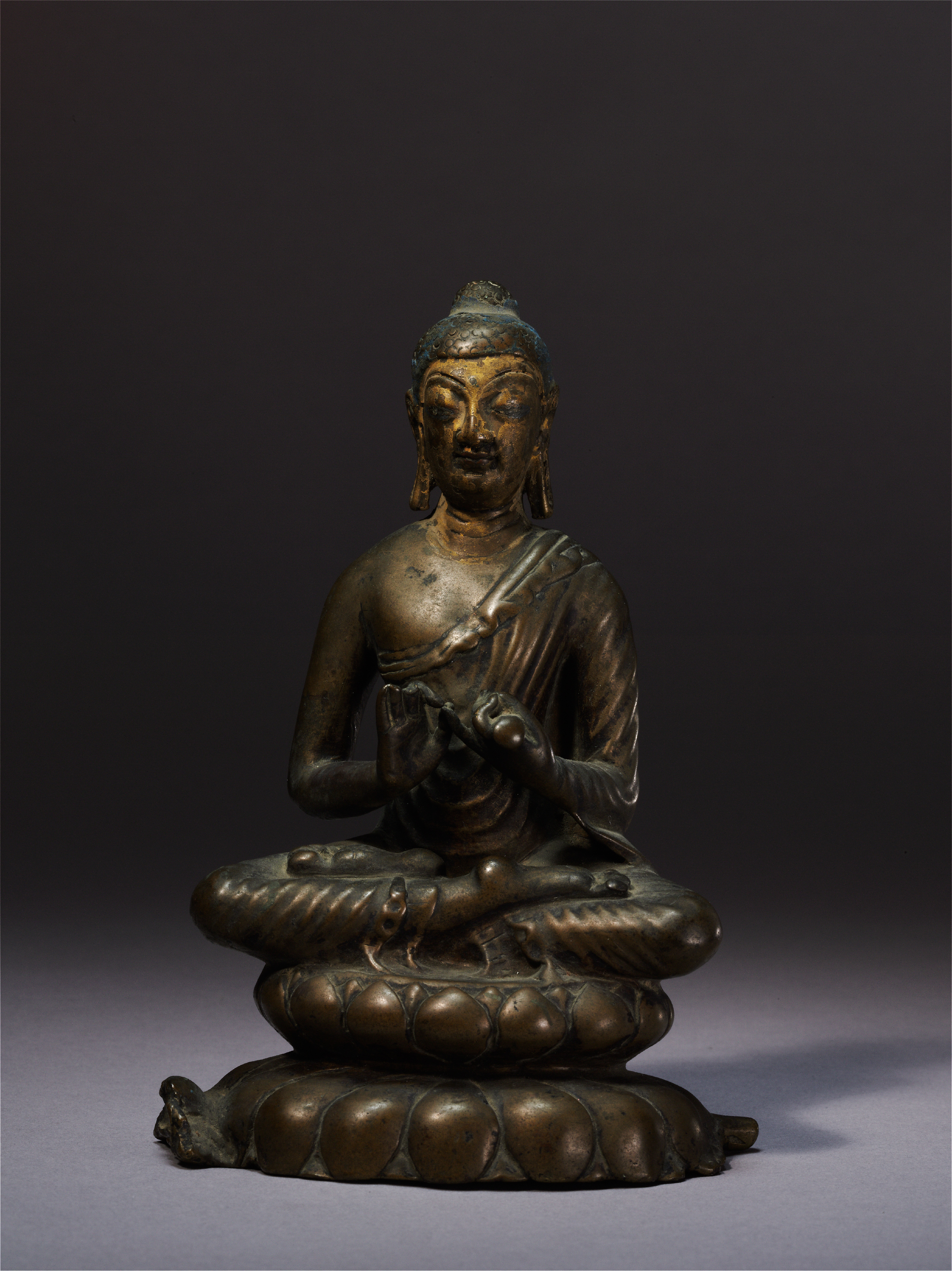 释迦牟尼佛双手施转法轮印,着袒右肩式袈裟,衣纹自然生动。面庞丰满,双眉在额部偏上,双目大张,鼻梁粗厚,笑容古拙。莲座跟身体宽度相比,略嫌窄小。莲瓣饱满,直接着地,属早期斯瓦特造像的特点。