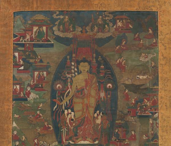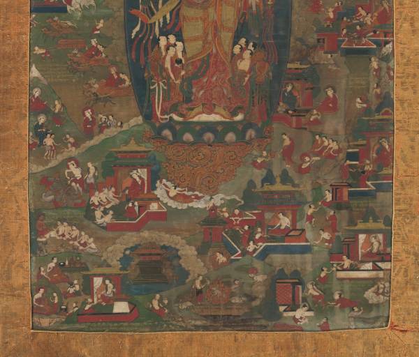 This painting depicts a rare subject in Tibetan art, the life of Buddha Shakyamuni and his previous incarnations as told in the Jataka tales. These stories form an essential component of the Buddhist cosmology. Two Jatakas recount the central teaching of bodhisattva’s self-sacrifice: Sibi Jataka in which the bodhisattva cut off his own flesh to feed the hungry, and the tale of Prince Sattva, who committed suicide in order to gift his body to a tigress so she could feed her starving cubs. This thangka has a Chinese inscription dating the work to the reign of the Ming Emperor Wanli (r. 1573–1619), as well as Tibetan glosses identifying the scenes depicted. The presence of the Tibetan inscriptions indicates that this thangka was made for a Tibetan client. Depicted around the central icon of a radiant Buddha are the narratives, each with mountains and monastic buildings serving as scene dividers.