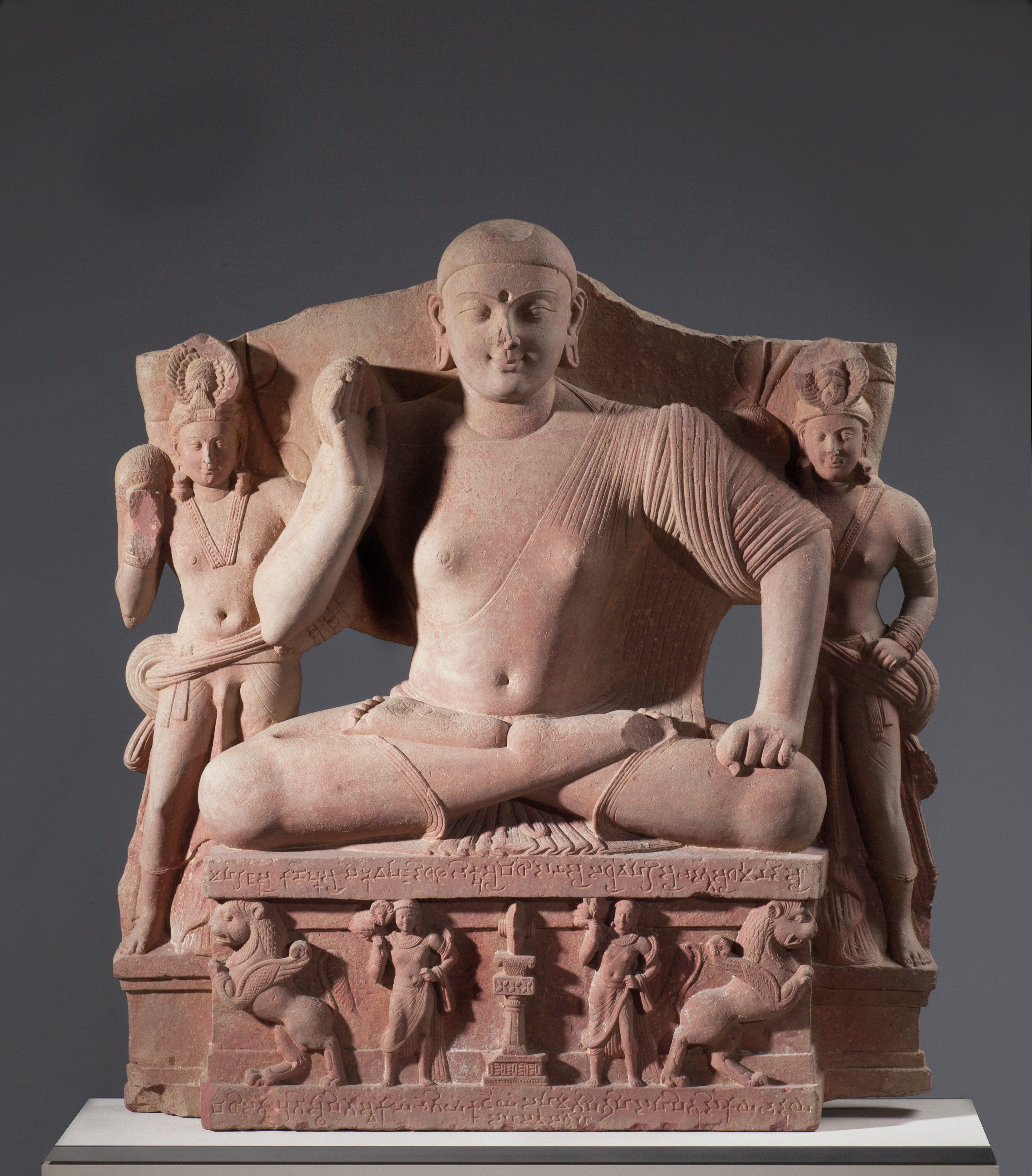 As prescribed by the scriptures, the palms of the hands and soles of the Buddha’s feet are marked with the lotus and the wheel, symbols of his divinity and teaching. Carved in high relief with generously modeled and sensuous torsos, the royal attendants flanking the Buddha have similar stylized facial features and archaic smiles as their lord. The sculpture is carved in the form of a stela and includes other symbols and figures referring to the Buddha’s life and exalted status as a universal monarch. The large halo behind his head represents the sun and proclaims his divinity. The pillar, topped by a wheel centered in the relief panel of the throne, is symbolic of preaching and refers to the Buddha’s first sermon at Sarnath. The two figures holding flywhisks, flanking the pillar, and the rampant lions signify the Buddha’s royal heritage.
