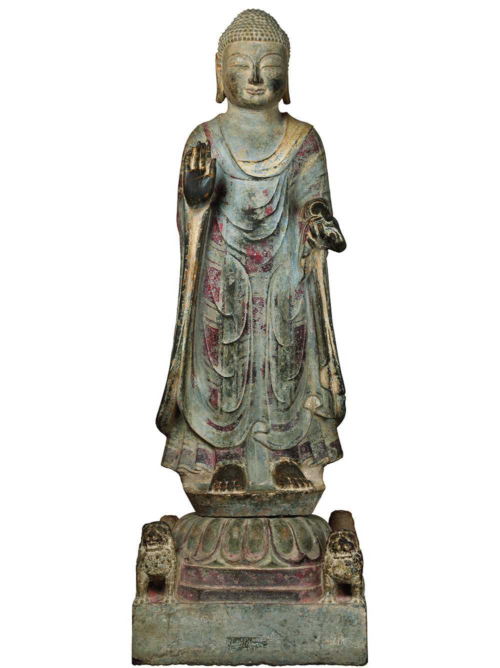 此像为园雕,像与座分体雕刻,架裟与座上原施彩,面部、颈部与手足等肉体部分贴金,现大部分已胞落、佛像肉医大而低绣,小螺发样列细密整齐,除型方圆饱满,眼清细长,鼻梁直征,嘴小后薄,左手握里裟衣角,右手起施无畏印,架裟厚重贴体,衣纹较为简洁,与人物姿态和动势相一致,佛像脚下为要莲座,莲游亮大,瓣尖向上粗起,富有力星厨,座的四角各有一避狮,两两相背,易首业牙,肌肉紧实,增添了造像则健有力的气势。