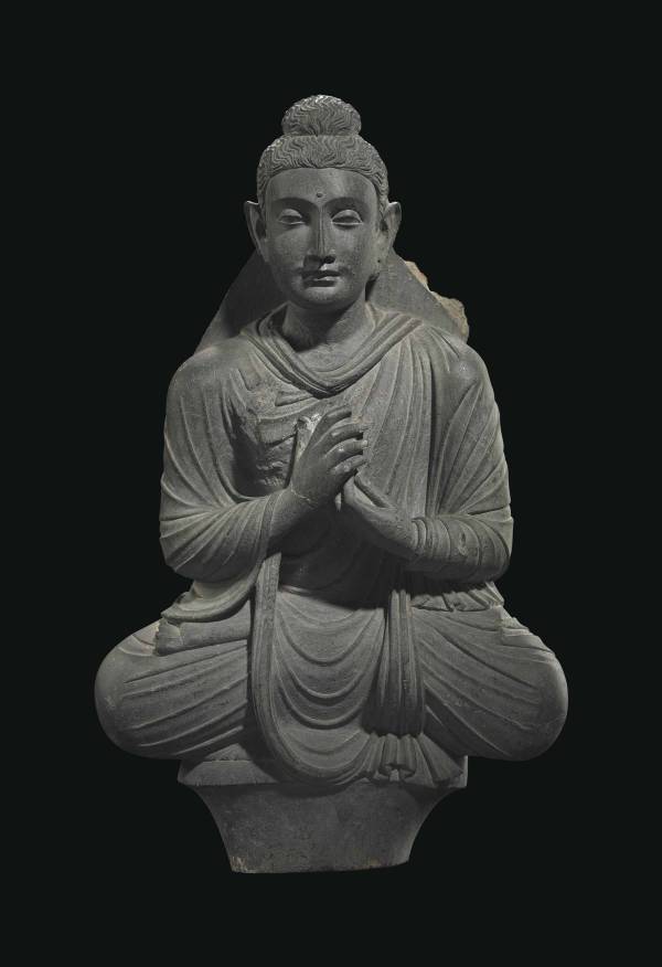 The representation of the Buddha as a teacher is an early and iconic image. The gesture of the hands in dharmachakramudra is symbolic of the Buddha's turning the Wheel of Law during the his first sermon, which set his teachings, dharma, in motion. Following his enlightenment in Bodh Gaya, the Buddha went into a park near Sarnath and preached his first sermon to five ascetics who then became the first Buddhist monks. The delicate folds indicating the sheerness of the robe, the features of the face and the wavy locks are particularly well carved. For another example of this unusual depiction of the teaching Buddha with the robe over both shoulders and a thick curved neckline, see W. Zwalf, A Catalogue of Ghandhara Sculpture in the British Museum, 1996, pp.87-88, fig.24.