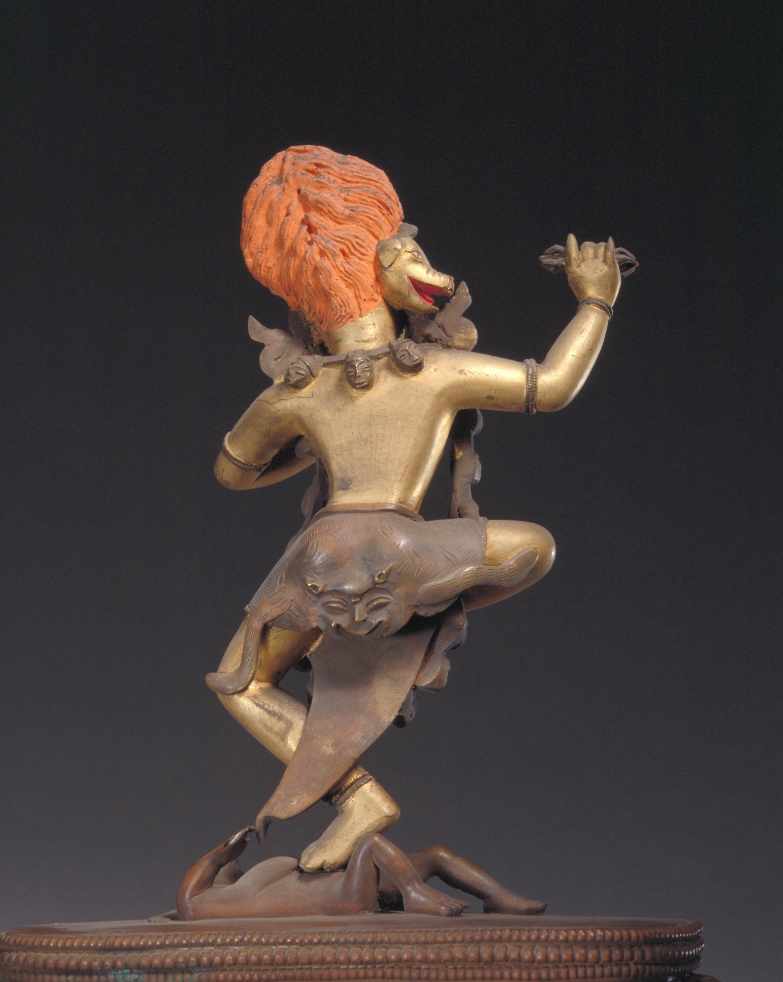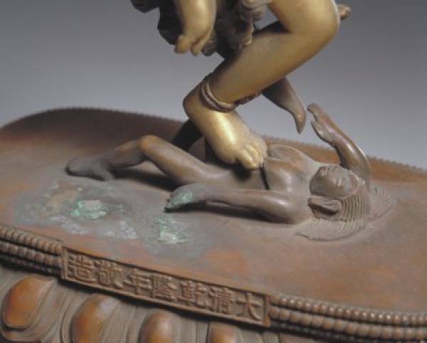 此尊金刚亥母一面三目二臂,头戴骷髅冠,赤发高耸,呈忿怒相,头部右侧伸出一猪头。金刚亥母赤裸全身,项挂人头项链,腰缠兽皮。左手捧嘎巴拉碗,左臂弯夹喀章嘎,右手举金刚杵。舞立姿,足下踩一人尸。椭圆形覆莲瓣底座,底座正面上沿中间铸阳文“大清乾隆年敬造”款,下沿刻“金刚亥母”,表明其身份。修行金刚亥母法可净除烦恼,显俱生智;调柔气脉,证无死果;降伏魔仇,摄十法界。