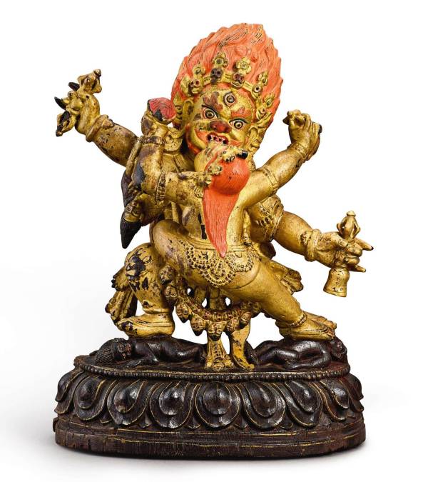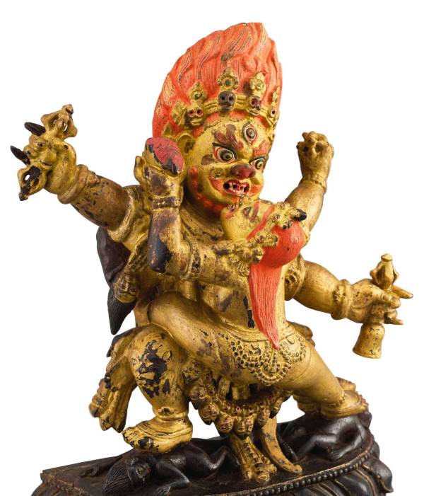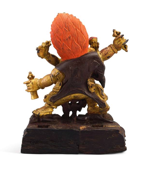 This finely carved zitan figure, which is preserved in unusually good condition with original gold and red pigments intact , depicts Mahachakra, a Tantric form of the bodhisattva Vajrapani appearing as a meditational deity.
