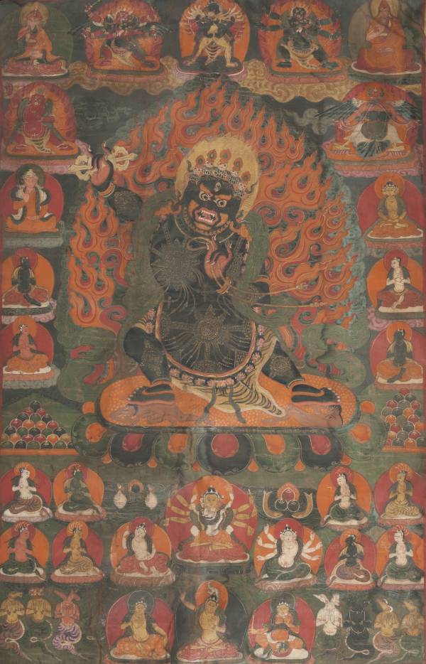 the wrathful protector standing in fierce alidhasana within a fiery halo atop a lotus throne, trampling underfoot two supine figures, with three bloodshot eyes and flaming beard and eyebrows, wearing the five-pointed crown, the six bone ornaments, the garland of severed heads and a tiger skin around the waist, holding a vajra in the raised right hand and a pasha in the left hand in tarjani mudra, surrounded by Padmasambhava, Chakrasamvara, Shadbhuja Mahakala and Garuda, with a retinue of naga figures in the lower register, framed in a textile mount