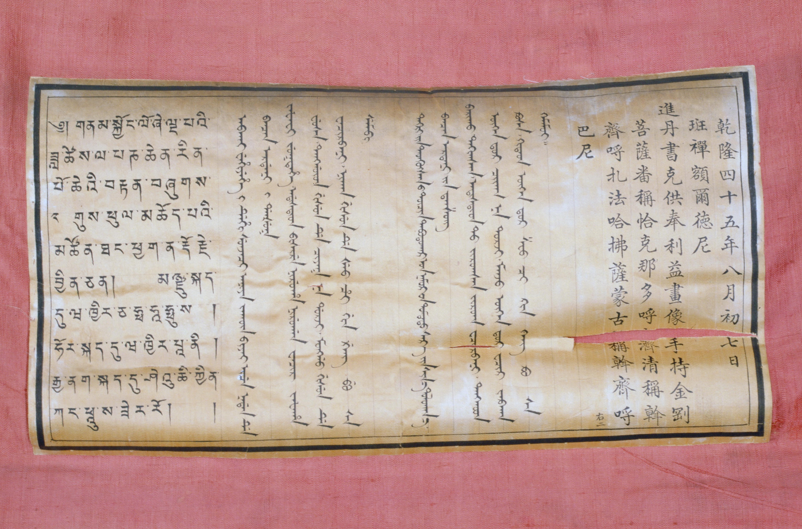 此手持金刚菩萨藏文名为“邬扎亚那金刚手”,蓝色身,面相忿怒,三眼圆睁,张口龇牙卷舌,火焰赤发,头戴五骷髅冠,周身以蛇为胳腋,身披象皮护甲,腰束虎皮裙,右手持金刚杵,左手结期克印,左展立姿,立于莲花宝座上,身后为火焰背光。上界为琼波大师、金刚贡却坚赞,下界为六臂勇保护法。唐卡以织金缎装裱,背面有汉满蒙藏四体墨书白绫签,汉文为:“乾隆四十五年八月初七日,班禅额尔德尼进丹书克供奉利益画像手持金刚菩萨。右二”。