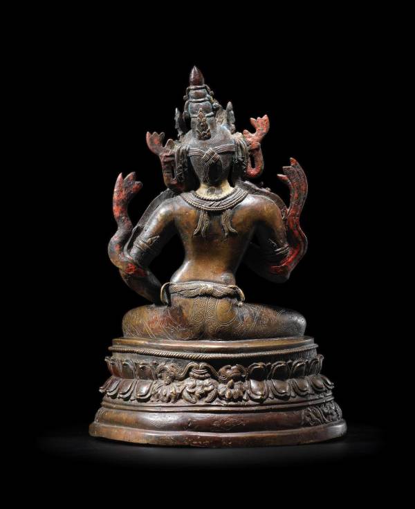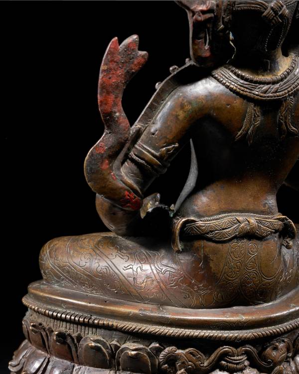 The bronze's overall style and iconography closely follow classic Pala models of 11th- to 12th-century Northeastern India known to have inspired early Tibetan sculpture. Compared to one such Pala Vajrasattva, the present bronze is modelled in an almost identical seated posture with a sensuous bend in the waist (von Schroeder, Indo-Tibetan Bronzes, Hong Kong, 2003, p.289, no.72E). Both sculptures afford Vajrasattva elegant proportions and naturalistically modelled fingers and toes. Both also reproduce Vajrasattva's scarf flailing upwards by his shoulder with 'fishtail' pleats.