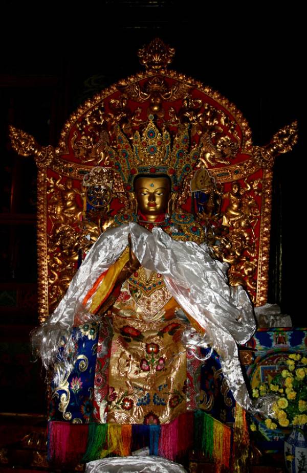 下面这尊,是四川甘孜州道孚县灵雀寺的弥勒菩萨。殿内虽然暗,说法印虽被哈达遮挡,善跏趺坐姿、肩花上的军持和八辐金轮还是很清楚的。